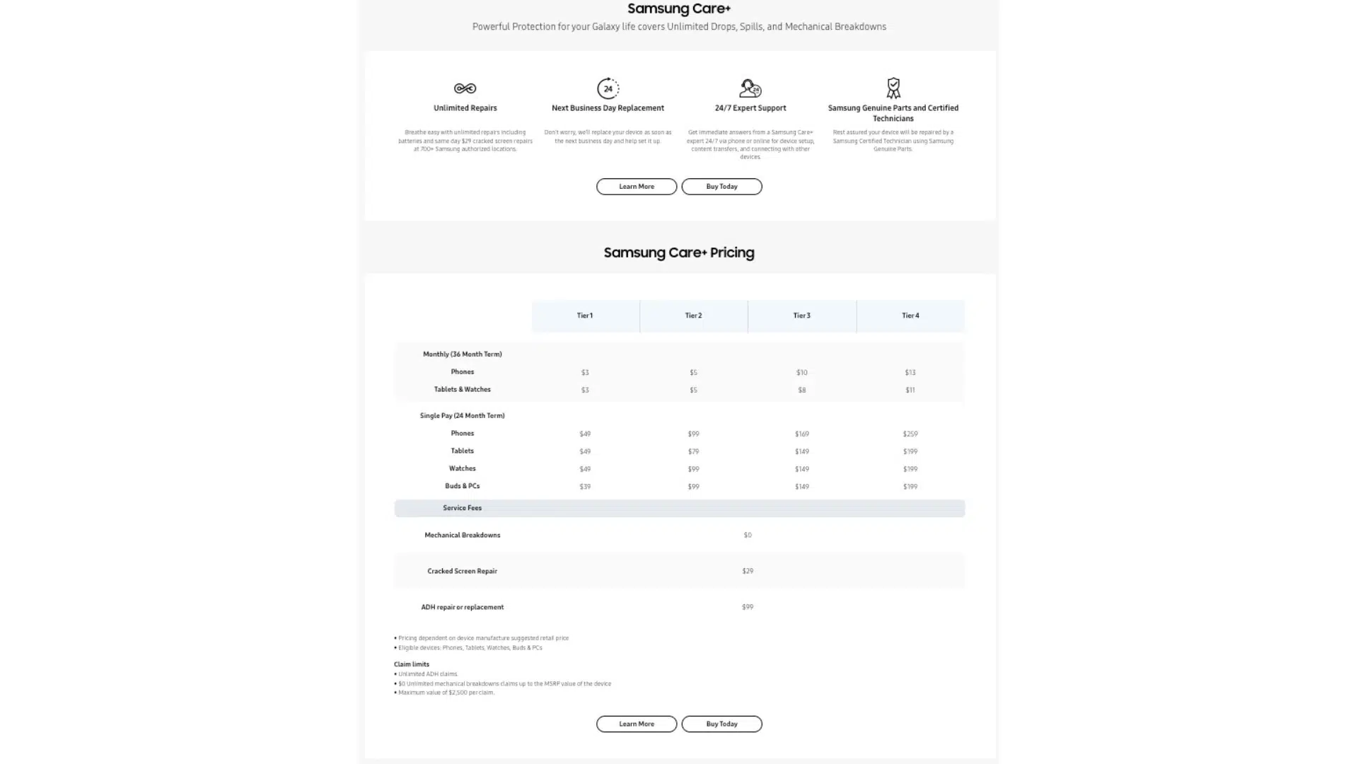 - Care+ Essentials: This only applies to Samsung's laptops and Buds. You pay anywhere from $19 to $89 to cover a 24-month term, depending on the device, and you'll pay nothing in the event of a mechanical breakdown.