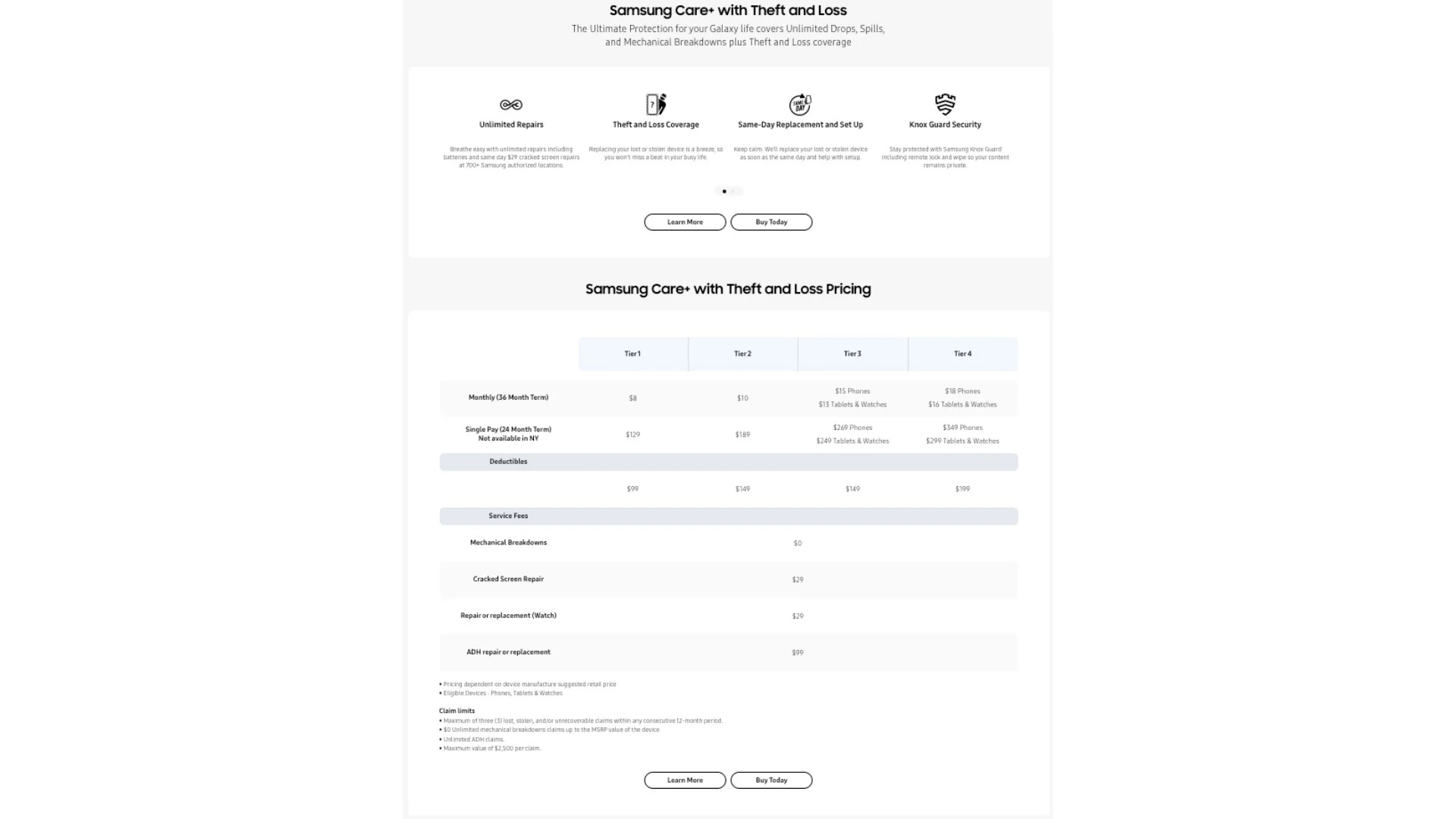 - Care+ with Theft and Loss: This is the highest plan offered and it covers everything that the Care+ plan does in addition to the Theft and Loss insurance plan. You'll pay between $8 and $18 monthly for 36 months, or $129 to $349 to cover 24 months. It also has a $99 to $199 deductible in case your device goes missing. This plan is available anywhere in the US.